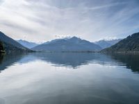 A picturesque view of Zell am See in Austria, nestled in the Alps in Europe. A stunning lake lies in the foreground, while the clear blue sky and open space offer an expansive overview of the surrounding mountains and nature.