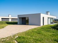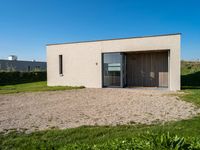 A view of a villa in the countryside of the Netherlands, Europe. Its modern architecture is made of composite materials which sits atop a dirt and gravel lot surrounded by trees and vegetation. There is an asphalt road surface, open space, and a clear sky overhead.
