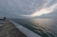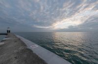 The dawn sun rises over an open space on the Chicago pier, casting a warm light over the concrete surface and giving a beautiful view of the lake and grey sky beyond.