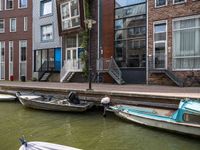 three small boats tied to the side of the canal in front of brick buildings and bicycles parked next to them