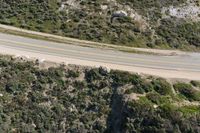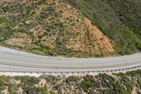 an aerial view of a person riding a motorcycle on the road below trees and a mountain