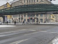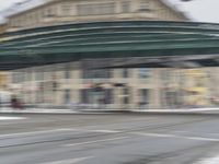 A snowy day in Berlin, Germany, showcasing the city's infrastructure and transportation. The image features a road with asphalt covered in snow, a bridge with an underpass, various buildings, street lights, and a tram passing by. The grey sky and motion blur add to the urban atmosphere of the scene.
