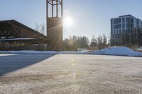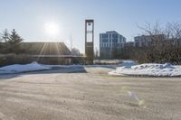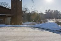 A residential area in Ontario covered in snow during winter, with houses, roads, and a clear blue sky.