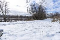 A scenic winter landscape in Ontario, Canada, with a snowy road leading straight down to a frozen lake. The natural environment showcases the beauty of the wilderness, with trees covered in snow and a cloudy sky overhead. The frozen lake reflects the surrounding landscape, creating a stunning winter scene.