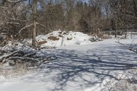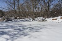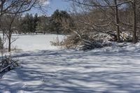 the view is from across a snow covered path with trees in the distance and a mound of snow near the edge