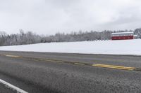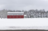 A scenic winter landscape in Uxbridge, Ontario, Canada, featuring a snow-covered road lined with trees and a red barn in the distance under a grey sky.