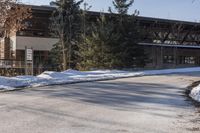 A snowy residential area in Ontario, with a clear sky and winter trees. The asphalt road and infrastructure blend harmoniously with the suburban homes, creating a picturesque scene of real estate in the freezing winter. The sunlight casts long shadows on the snow-covered ground, while a river flows peacefully in the background.