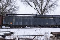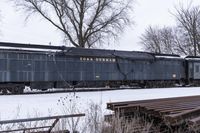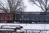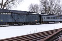 A gloomy winter day in Toronto, Canada, showing a snow-covered landscape with a factory, railroad tracks, and a locomotive.