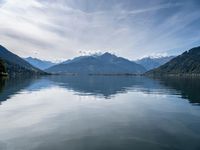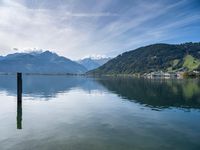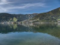A view of the glacial lake and highland landscape of Zell am See in Austria, with its clear sky and cumulus clouds, providing the perfect atmosphere for recreation and activities. The open space offers an overview of the terrain, coastal bank, and surrounding tree-filled nature, with the sunlight and contrails of a distant aircraft creating a stunning azure atmosphere.