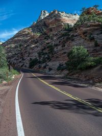In the heart of Utah, the straight road leads through the breathtaking landscape of Zion National Park. With the clear sky above and the mountains in the distance, it's a picture-perfect scene of natural beauty. The asphalt road stretches into the horizon, inviting travelers to explore the wonders of this stunning national park. Whether you're driving or walking, the road offers a unique perspective of the one-quarter landscape, with clouds floating above and nature all around.