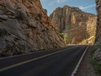 In the heart of Utah, the straight road leads through the majestic landscape of Zion National Park. The asphalt road stretches towards the horizon, casting long shadows under the clear sky. Mountains rise on either side, creating a stunning backdrop for the journey. As you travel along the road, the hard shadows play on the pavement, adding depth to the scene. This road offers a unique perspective, allowing you to experience the beauty of nature and the grandeur of the American Southwest.